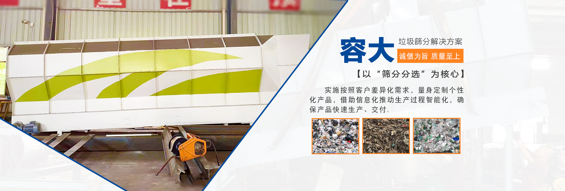泉州容大機(jī)械有限公司是一家專(zhuān)研生活垃圾分選的企業(yè),以“篩分分選”為核心,實(shí)施按照客戶(hù)差異化需求,量身定制個(gè)性化產(chǎn)品,柔性化生產(chǎn)管理模式,以智能制造為主攻方向,以客戶(hù)需求為中心,借助信息化推動(dòng)生產(chǎn)過(guò)程智能化,確保產(chǎn)品快速生產(chǎn)、交付。生活垃圾處理領(lǐng)域內(nèi)的技術(shù)研究,利用篩分、分選技術(shù)的核心競(jìng)爭(zhēng)力,圍繞“智能、高效、節(jié)能、環(huán)?!卑藗€(gè)大字為中心,為循環(huán)經(jīng)濟(jì)項(xiàng)下的各種生活垃圾處理項(xiàng)目提供成套的技術(shù)解決方案 ...